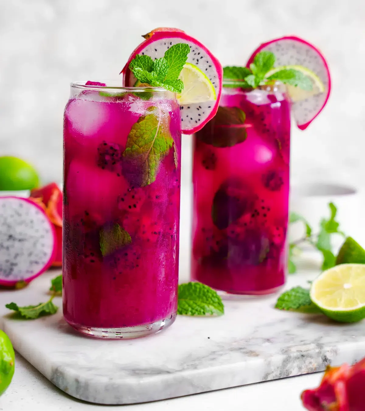 • Dragon Fruit Mojito: Dragon fruit, lime, simple syrup, white rum, mint leaves, crush ice, soda