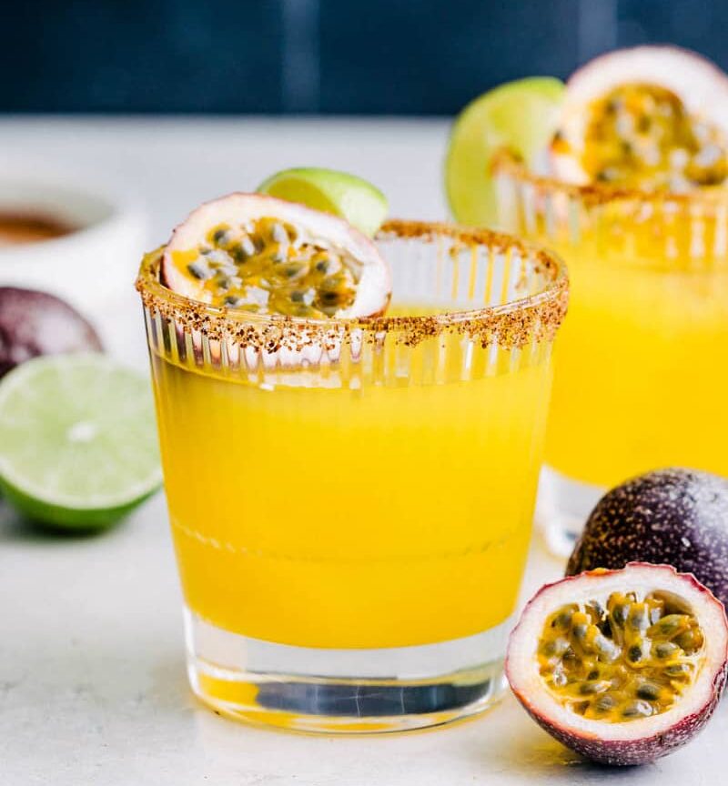 • Passion Fruit Margarita: Blanco tequila, passion fruit juice, lime juice, triple sec, ice (salt rim), lime slice garnish